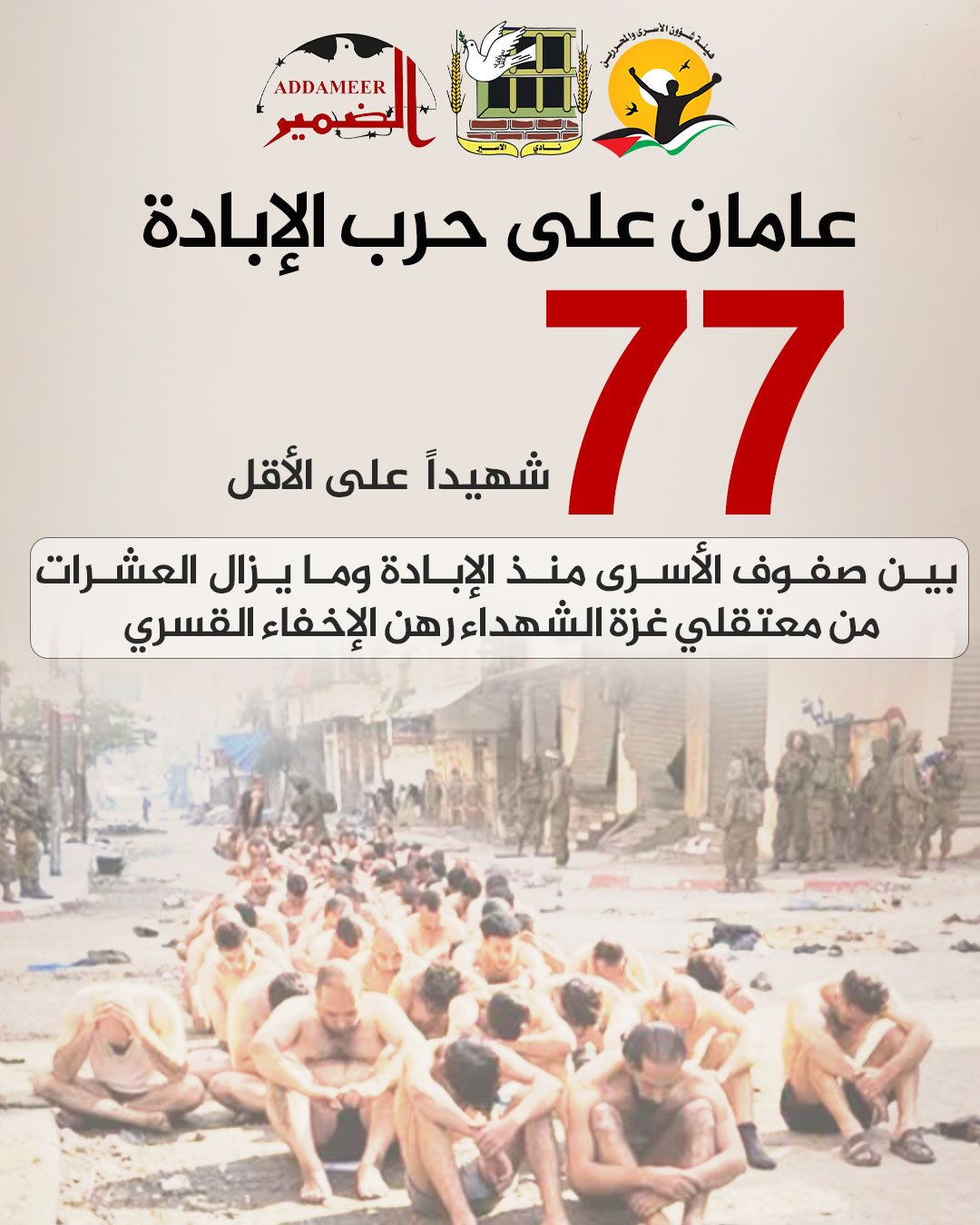بعد مرور عامين على بدء حرب الإبادة الشاملة والمتصاعدة على شعبنا في قطاع غزة، وامتداد العدوان الشامل على الجغرافيات الفلسطينية كافة، تستعرض مؤسسات الأسرى عبر ورقة حقائق واقع قضية الأسرى بعد الإبادة، تشمل معطيات وأرقاماً، ومن خلالها تحاول المؤسسات أنّ تعكس حرب الإبادة الممتدة داخل سجون ومعتقلات الاحتلال الإسرائيلي. حيث توسع مفهوم حرب الإبادة ليشمل الحركة الفلسطينية الأسيرة، التي تواجه اليوم ذروة عمليات المحو الاستعماري الاستيطاني. ففي ظل تصعيد غير مسبوق، تشهد السجون وجهًا آخر من وجوه الإبادة عبر تنفيذ عمليات قتل وإعدام متعمدة للأسرى والمعتقلين. وقد بلغت حصيلة الشهداء الأسرى الذين أُعلِن عن هوياتهم منذ بداية الحرب 77 شهيداً على الأقل، بينما يظل العشرات من معتقلي غزة الذين استشهدوا قيد الإخفاء القسري. تشكّل هذه الحصيلة شهادة دامغة على أكثر الأزمنة وحشية في تاريخ حركتنا الأسيرة التي صمدت لعقود في مواجهة منظومة السجون التي عملت على تدمير الأسير جسدياً ونفسياً وتصفيته بشتى الوسائل.
